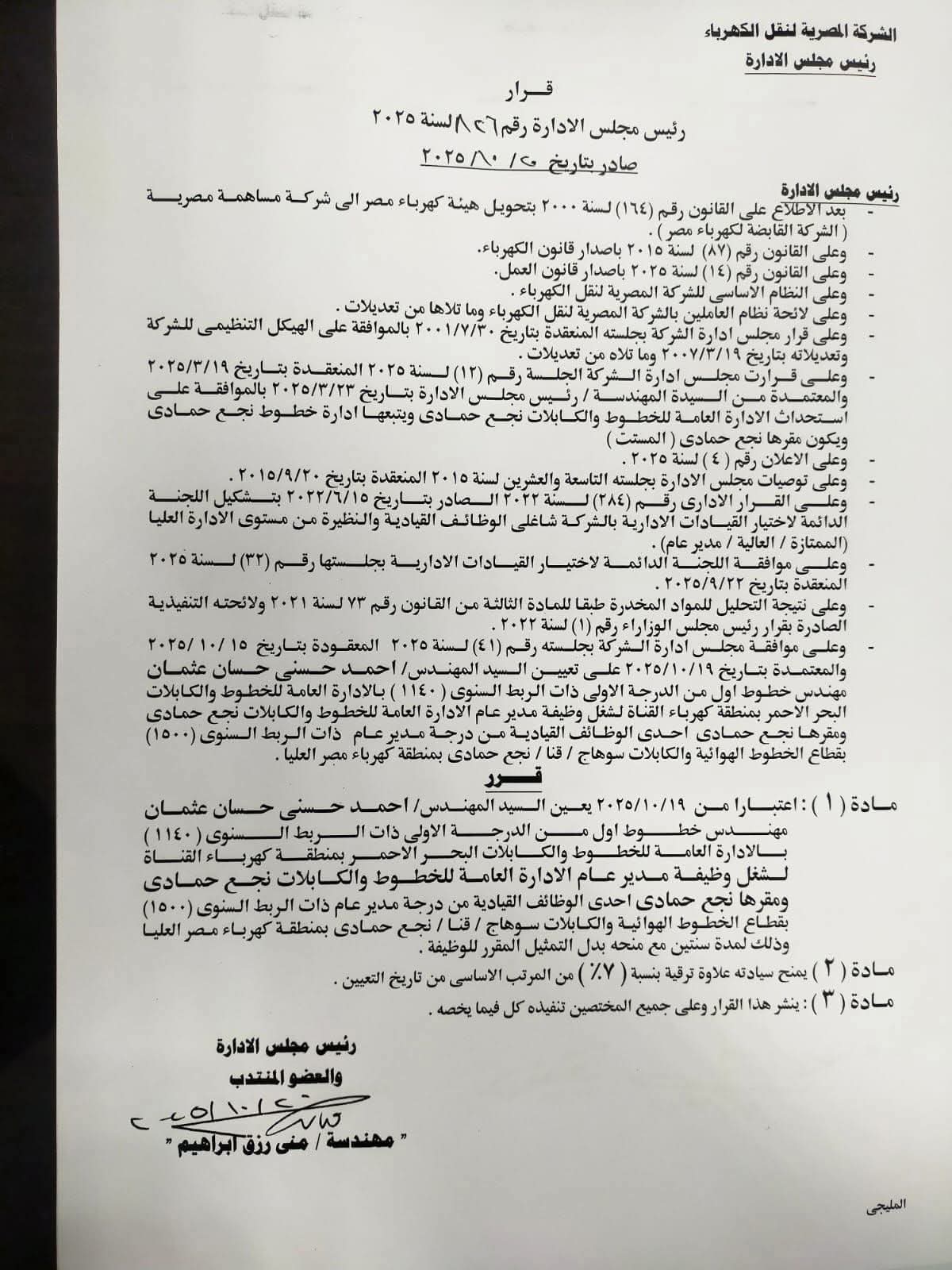 أصدرت المهندسة مني رزق رئيس الشركة المصرية لنقل الكهرباء قرارا بتعيين المهندس احمد حسني مدير عام الادارة العامة للخطوط والكابلات نجع حمادى بمنطقة كهرباء مصر العليا وذلك لمدة عامين مع منحه بدل التمثيل المقرر للوظيفة