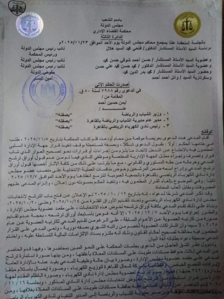 حيث اصدرت الدائرة الثالثة بمحكمة القضاء الإداري بمجلس الدولة حكمها اليوم الأحد الموافق ٢٣ نوفمبر ٢٠٢٥ بأحقية كل من أيمن حسين وعوض الفاوي و أحمد مصطفى و ماهر شقران المرشحين لخوض انتخابات مجلس إدارة نادي الكهرباء الرياضي ..