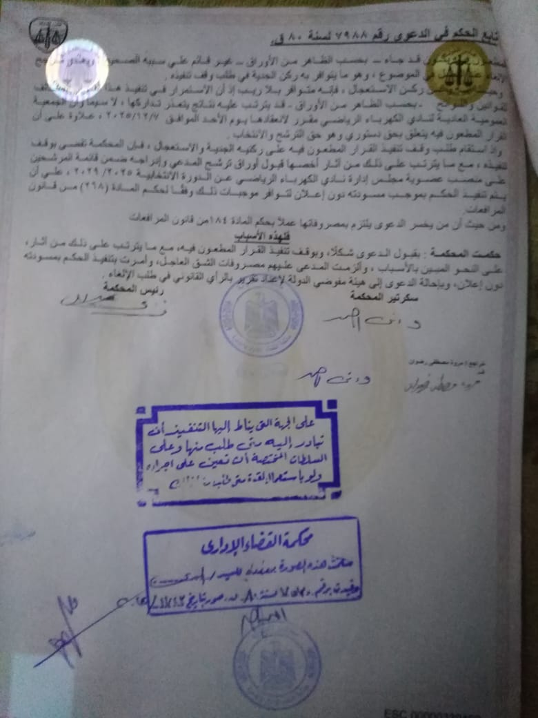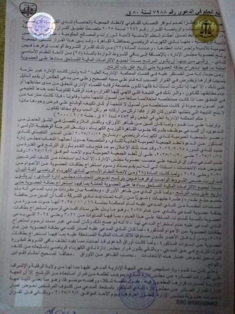 مفاجئة تربك الحسابات ..القضاء ينتصر ل4 مرشحين ويعطيهم الحق في الترشح لعضوية نادي كهرباء القاهرة بعد استبعادهم