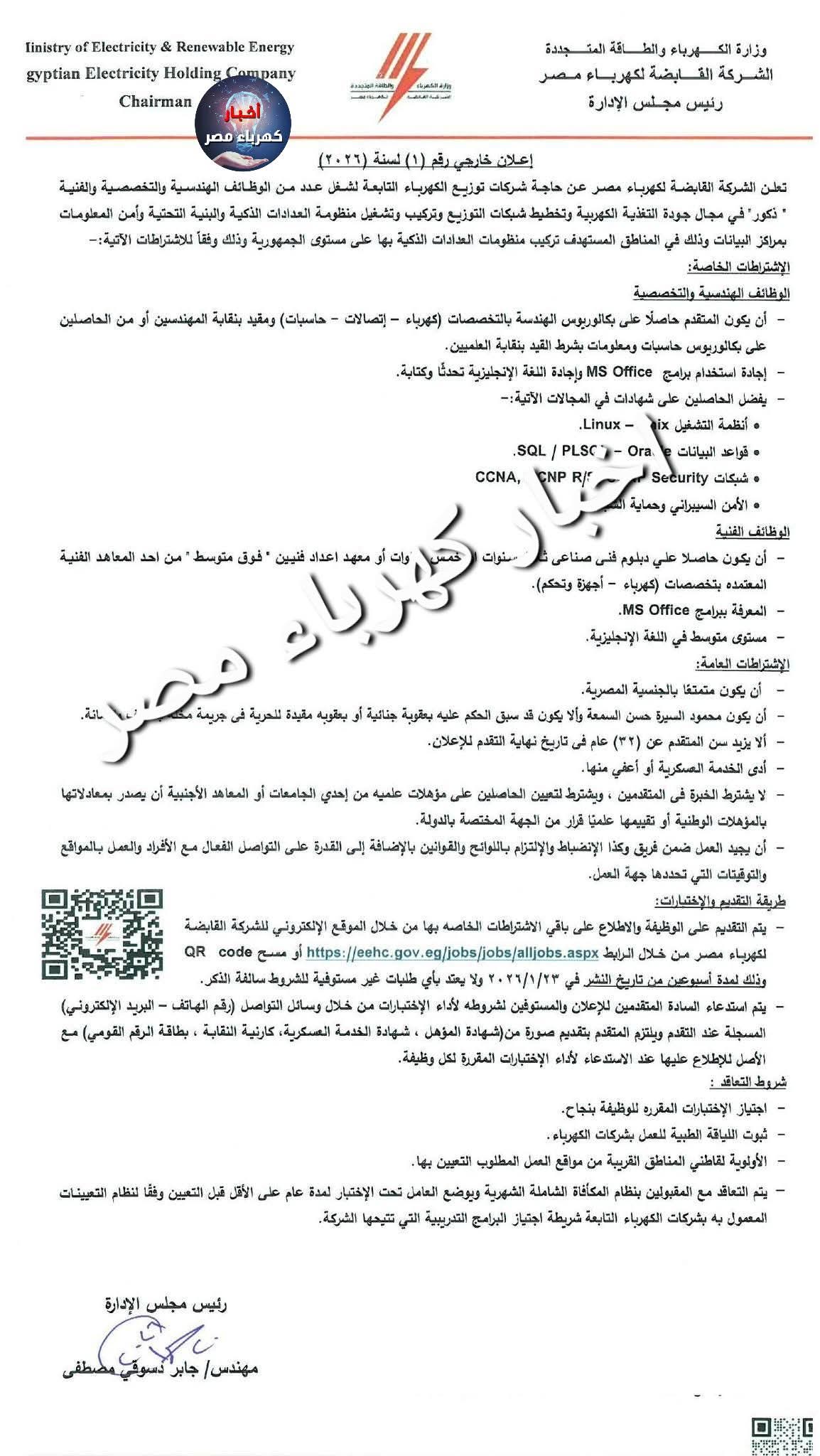 أعلنت الشركة القابضة لكهرباء مصر عن حاجتها لعدد من الوظائف الجديدة للفنينين والمهندسين في تخصصات مختلفة ..واكدت القابضة في الاعلان رقم رقم (1) لسنة (2026) ان شركات توزيع الكهرباء التابعة لها تحتاج لشغل عدد من الوظائف الهندسية والتخصصية والفنية ” ذكور” في مجال جودة التغذية الكهربية وتخطيط شبكات التوزيع وتركيب وتشغيل منظومة العدادات الذكية والبنية التحتية وأمن المعلومات بمراكز البيانات وذلك في المناطق المستهدف تركيب منظومات العدادات الذكية بها على مستوى الجمهورية سيتم فتح باب التقديم إعتباراً