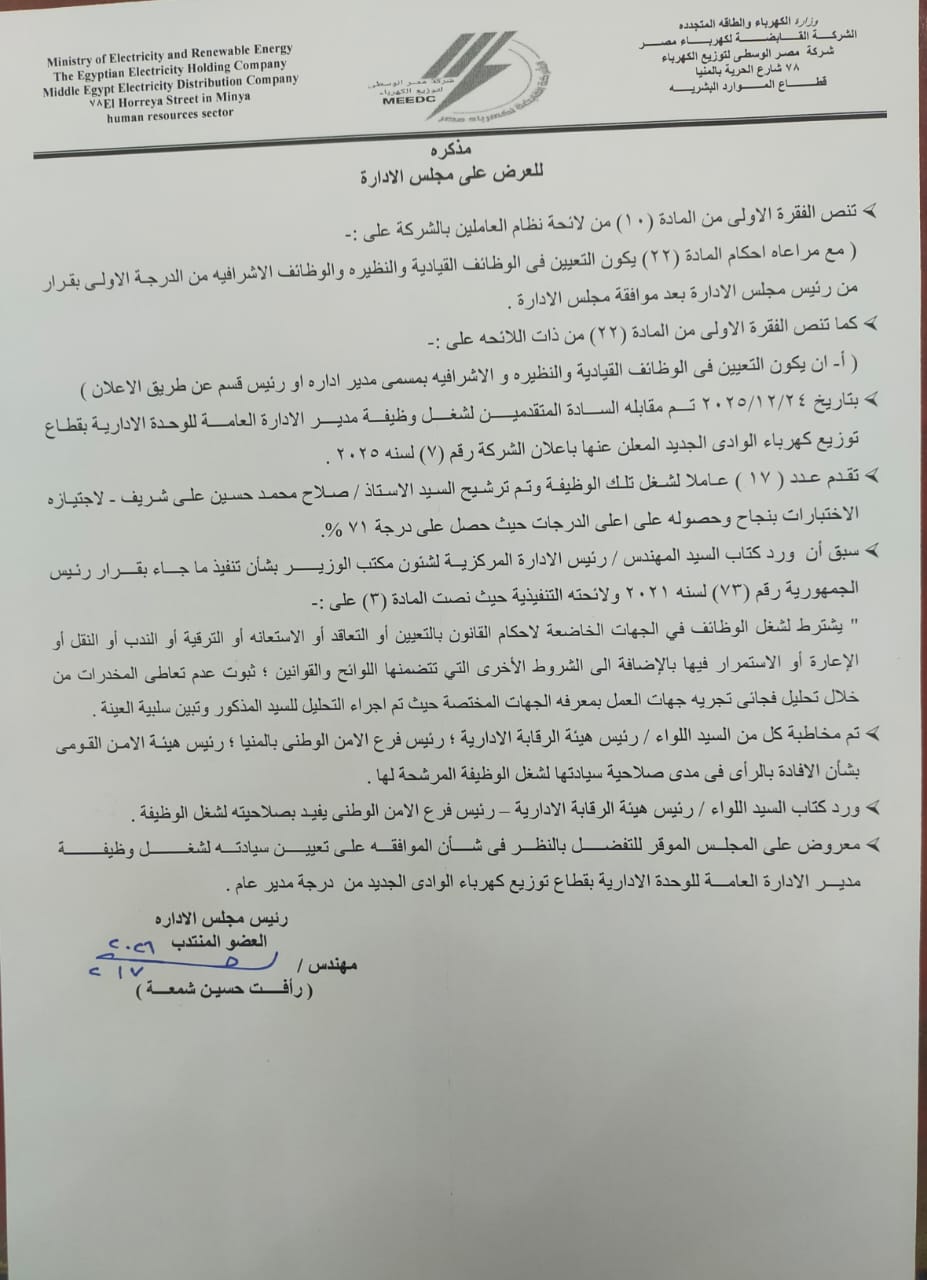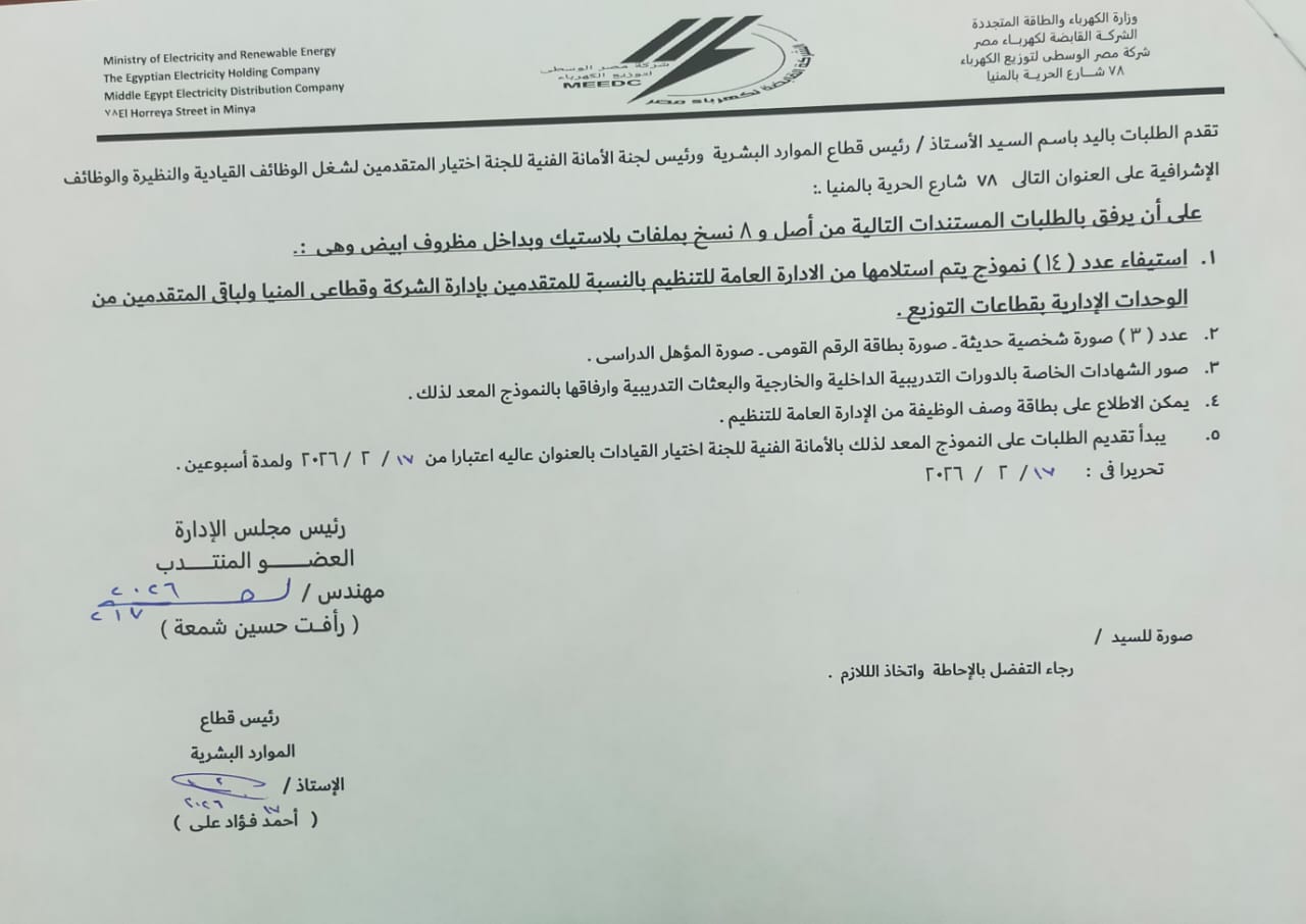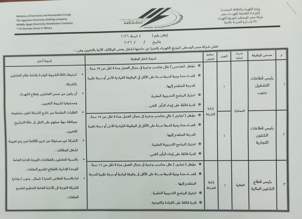 شركة مصر الوسطى لتوزيع الكهرباء تعلن عن ترقيات محدودة ووظائف شاغرة جديدة